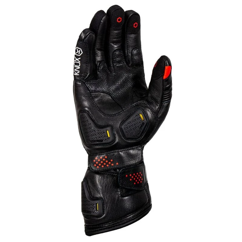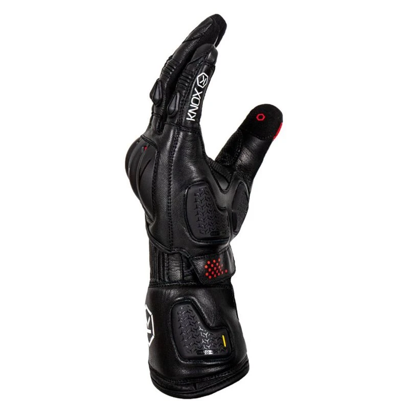 Practical and aesthetic details are taken care of with an Amara Silicone grip pad on the palm which makes it a more comfortable glove to use on a bike. There is spot colour raised detailing on the strap, fingertips and the wrist where a stretch accordion feature makes for a secure and comfortable fit. Fingers are perforated for breathability and are touch screen enabled. The Knox Icon is printed on both the cuff and side of the hand.