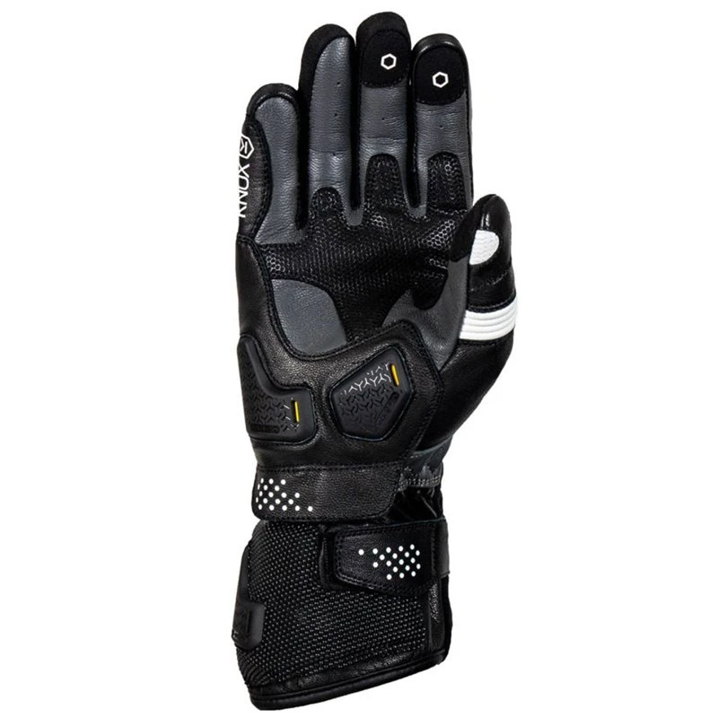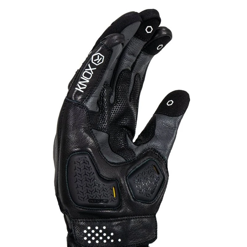 Practical and aesthetic details are taken care of with an Amara Silicone grip pad on the palm which makes it a more comfortable glove to use on a bike. There is spot colour raised detailing on the strap, fingertips and the wrist where a stretch accordion feature makes for a secure and comfortable fit. Fingers are perforated for breathability and are touch screen enabled. The Knox Icon is printed on both the cuff and side of the hand.