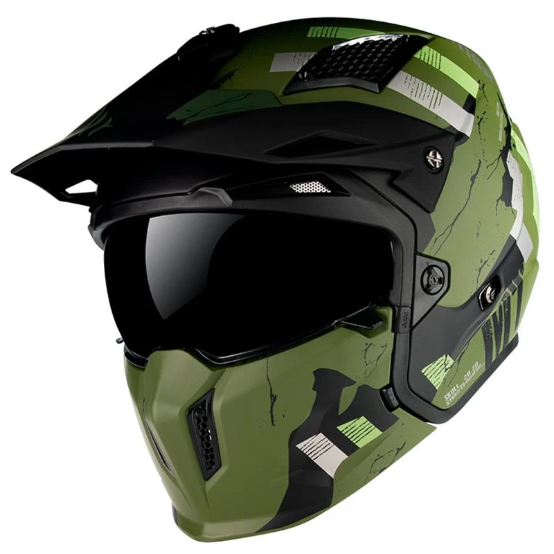 The new MT Helmets Streetfighter is a Crossover open face jet helmet with a removable mask, removable peak and drop down innner sun visor. The Streetfighter has removable and washable cheek pads and a fire retardant fabric lining. For safety the MT Streetfighter has a full metallic micrometric buckle and a high impact absoption inner shell with multiple density inner polystyrene.