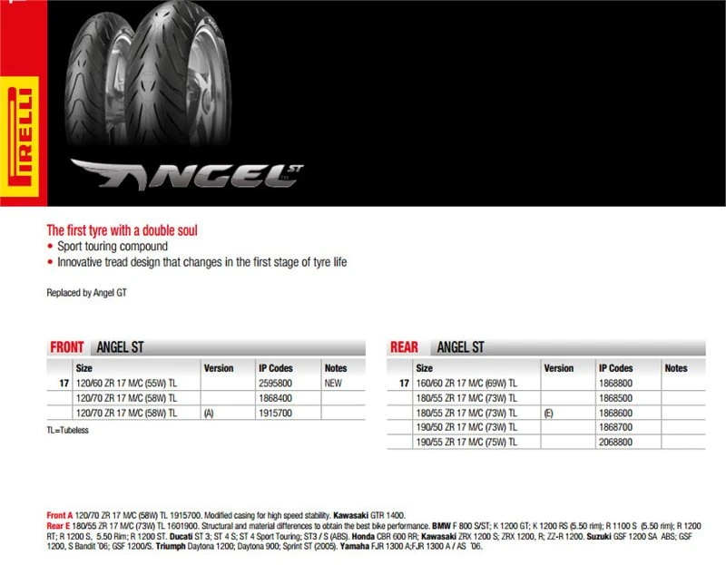Note: E Spec tires are OE on Buell XB12T, BMW R 1200R, R 1200RT, R 1200ST, F 800ST K 1200GT and Yamaha FJR 1300 and is reinforced for heavier sport touring bikes.