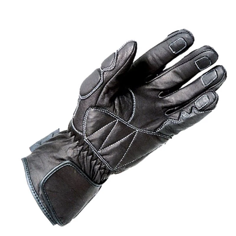 Waterproof sports glove with lightweight lining, leather covered moulded knuckle protector, reinforced palm, elasticated wrist and velcro cuff closure.