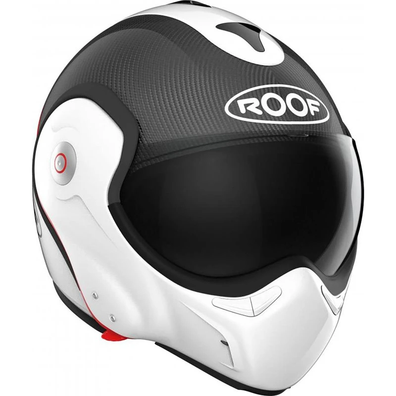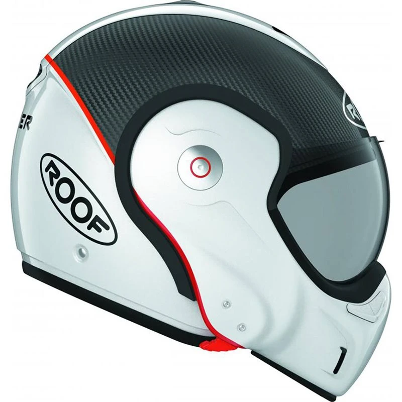 One of the most iconic helmets on the planet just got even more iconic. The Roof Boxer V8 now has a carbon fiber brother: The Boxxer Carbon is here. Major evolution is identifiable by an extra X in the name! The name says it already, but the biggest news is the new carbonfiber/fiberglass multi-composite shell. It doesn’t only look good, together with the double density EPS liner it offers ultimate protection and low weight. Another big improvement is the new locking system. With the Boxer V8 you have to push the locking mechanisms manually on both sides. The Boxxer Carbon sports an automatic locking system: just push the chin piece down and it will click right into place.