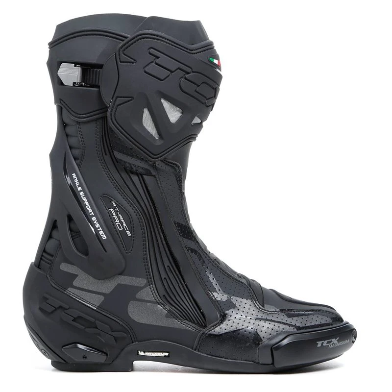 Designed for maximum control at the track, the TCX RT-Race Pro Air Boots achieve a high level of dexterity without sacrificing protection. To maintain a lightweight construction, the RT-Race Pro Boots use durable microfiber and strategically-designed injection-molded components, including the iron mesh intake-equipped polyurethane shin plate and shift pad, front and lateral panels, heel counter and Double Flex Control System.